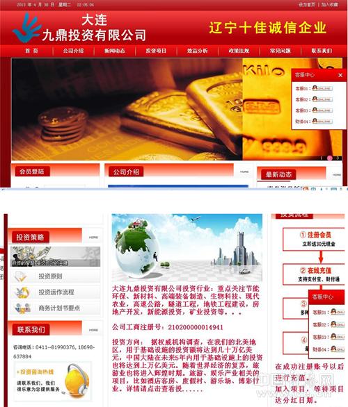 自4月29日至今,大连九鼎公司的网址已经无法打开,王先生给记者提供的网页截图显示,该公司自称是辽宁十佳诚信企业,公司重点关注节能环保、新材料、高端装备制造、生物科技等行业投资。在该网页显眼位置标明了公司的注册号,依据注册号可查该公司在大连工商局的注册信息。