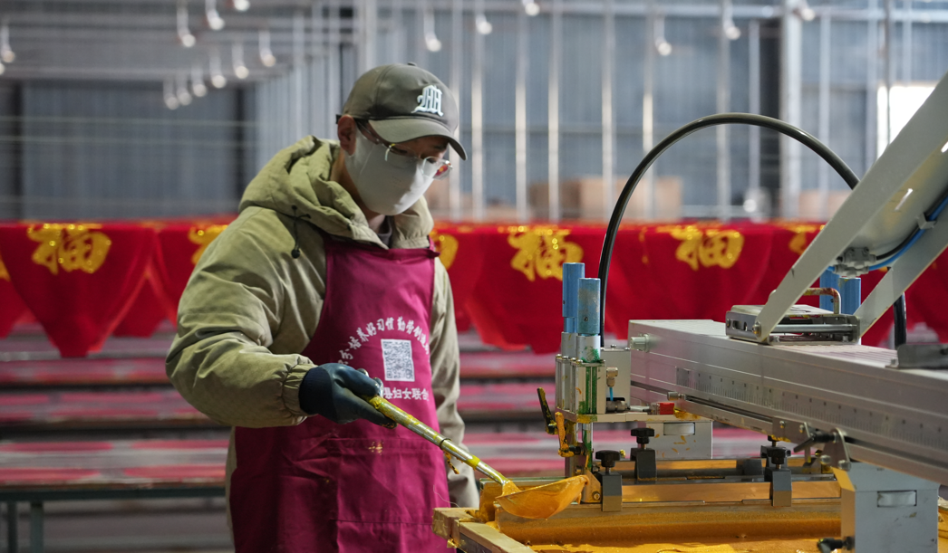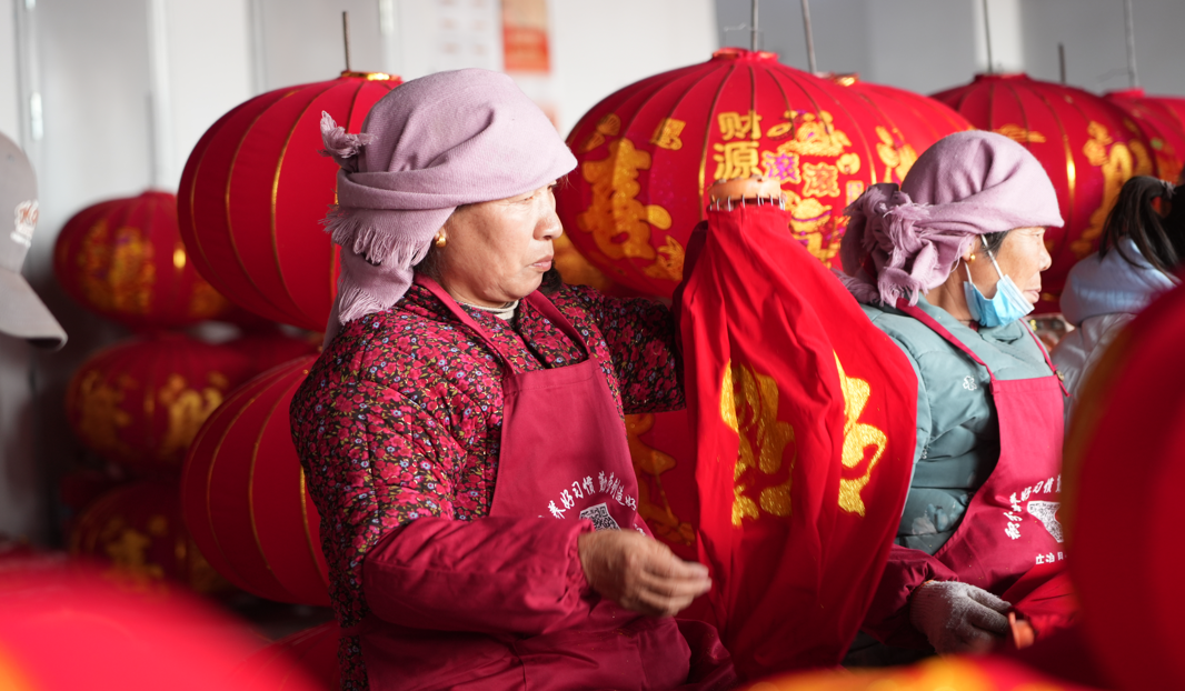 1月13日,工人们在甘肃庄浪县宫灯产业园制作灯笼。随着春节临近,灯笼订单急剧增长,当地加班加点,赶制大红灯笼。