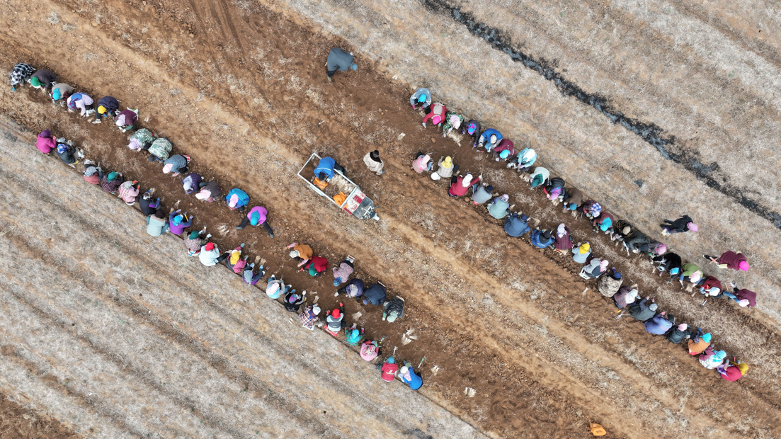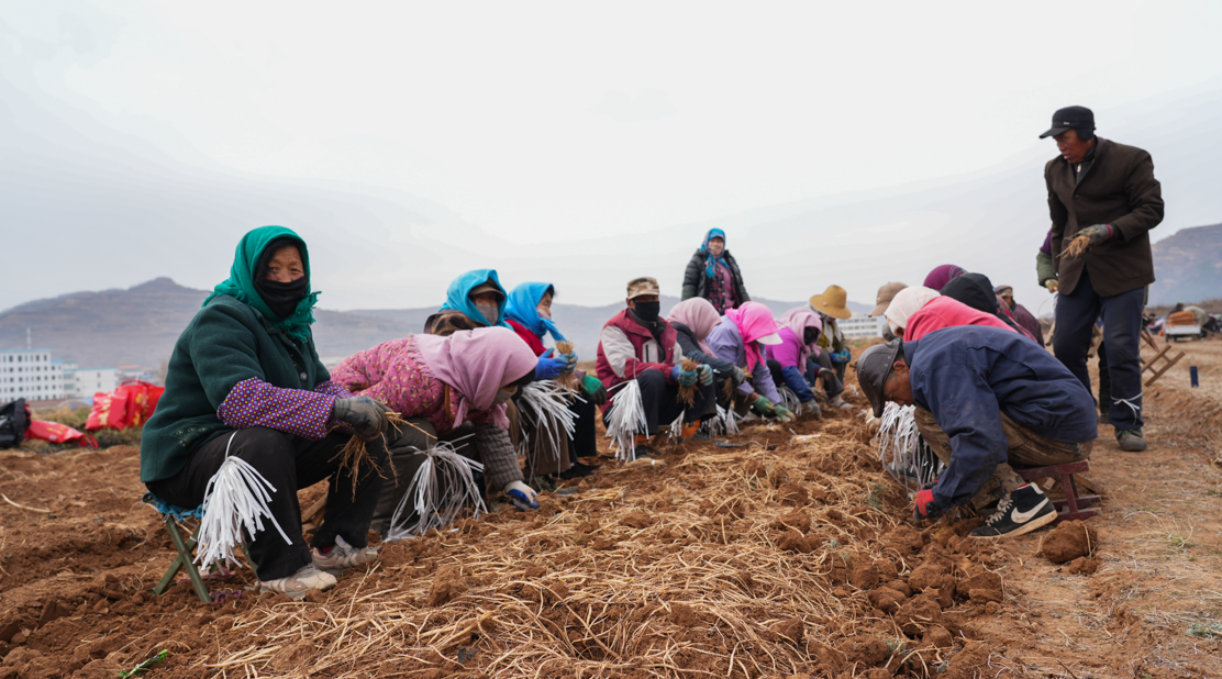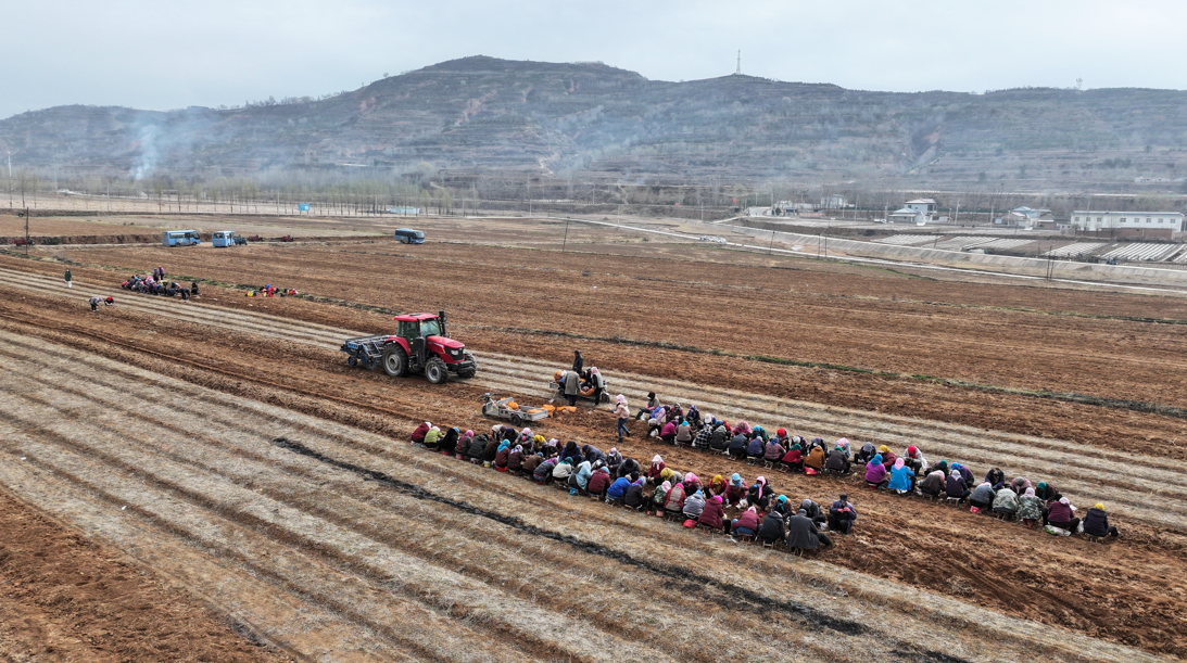 3月25日,在甘肃省庄浪县通化镇中药材育苗基地,工人和机械相互配合,采挖药苗、翻整土地,一派春忙图景。