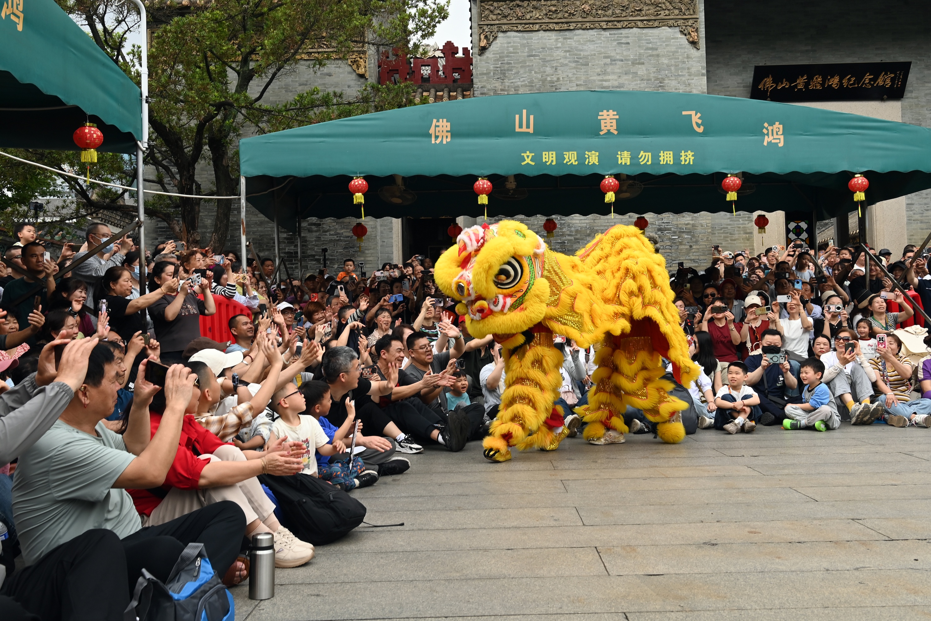 在佛山市祖庙博物馆,一场醒狮表演正精彩上演。只见分由两名演员扮演的金红两狮伴随着鼓点在广场上奔腾跳跃,时而与场外游客互动,又忽而飞上梅花桩,腾挪舞动间将狮子憨态可掬、威风凛凛的不同状态演绎得栩栩如生。在场观众不时爆发出阵阵喝彩。