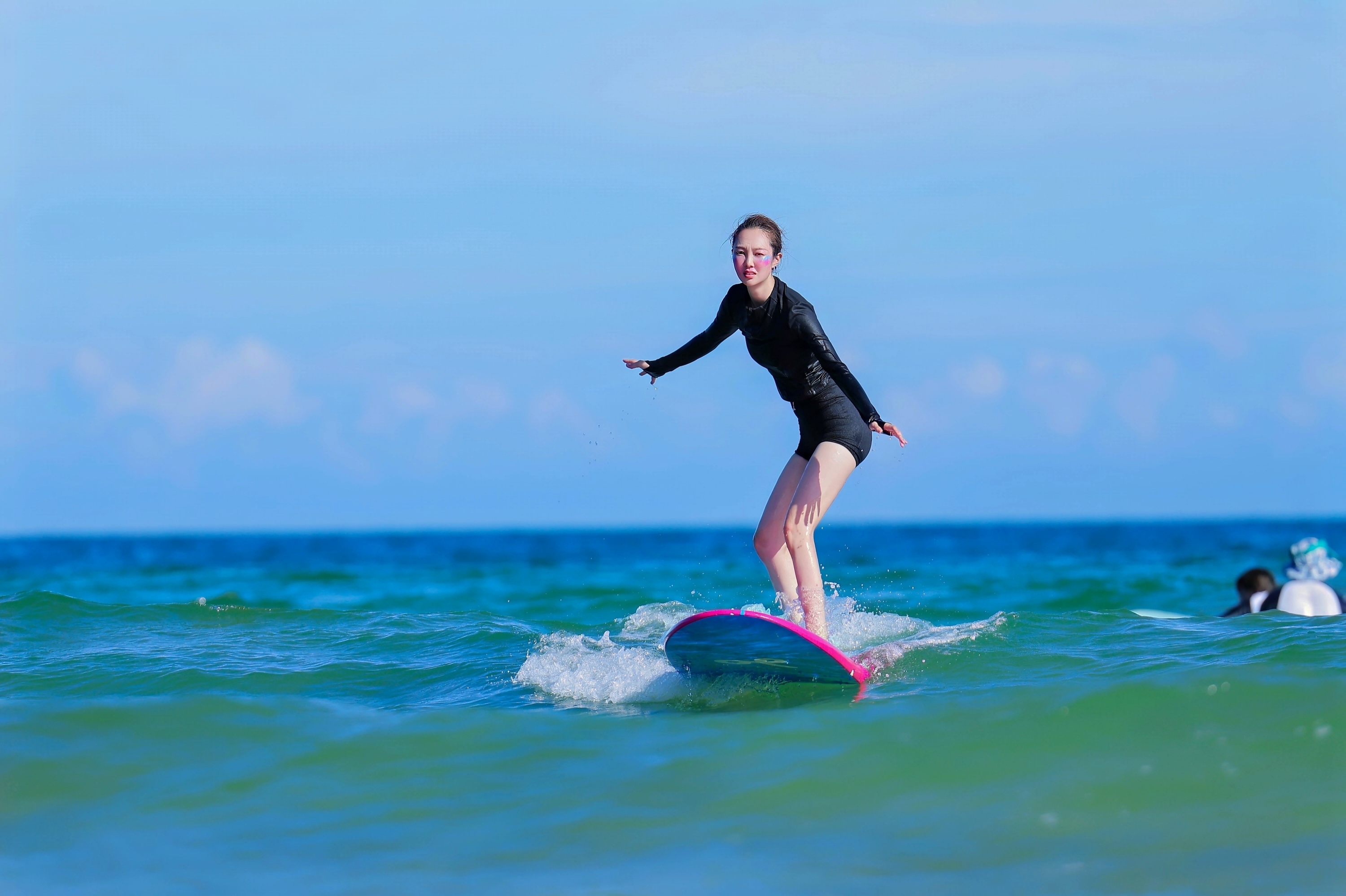 游客在深圳西涌4号沙滩附近海域体验冲浪。周益葵摄