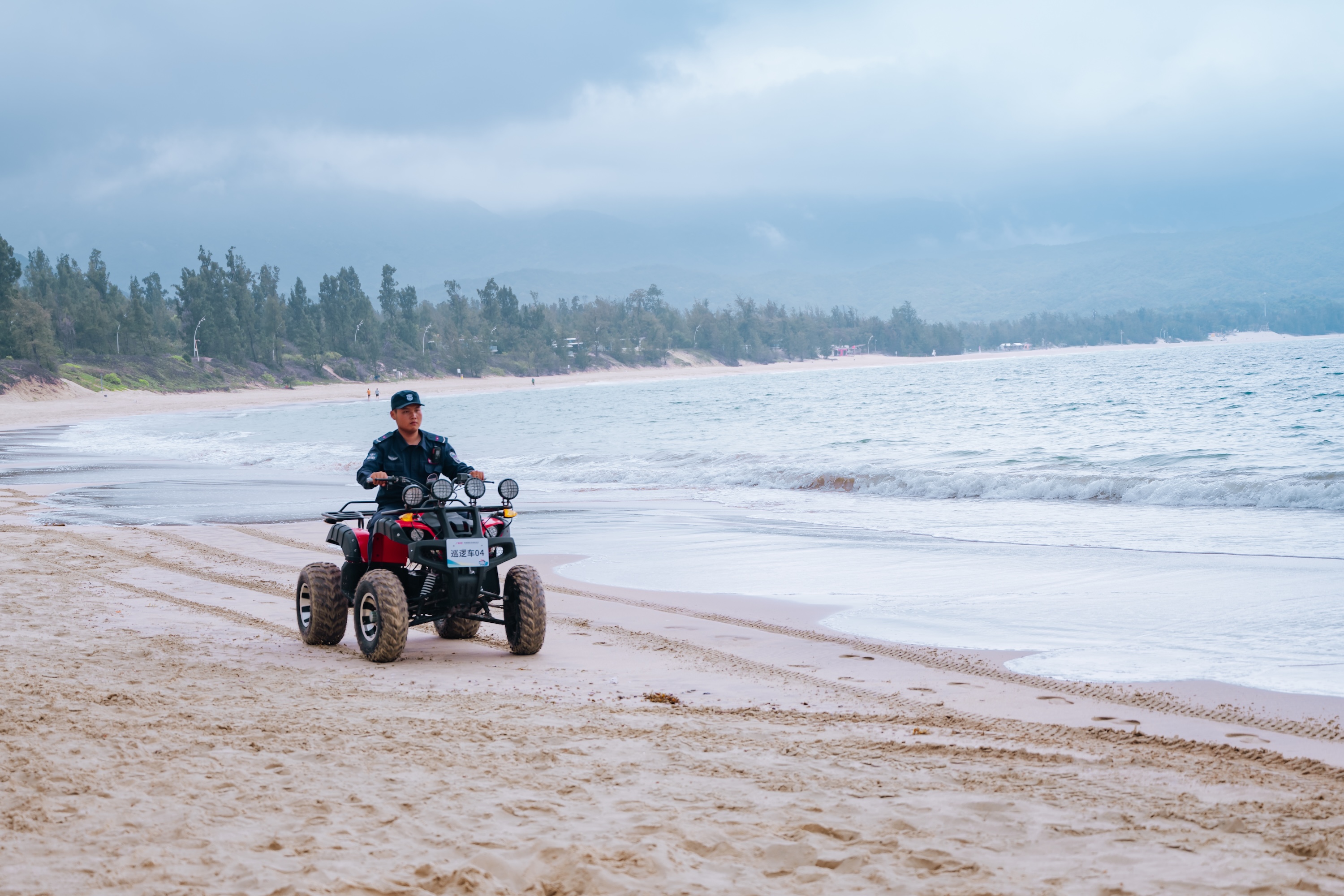 保利物业工作人员驾驶沙滩车在西涌海滩巡查。邱活摄