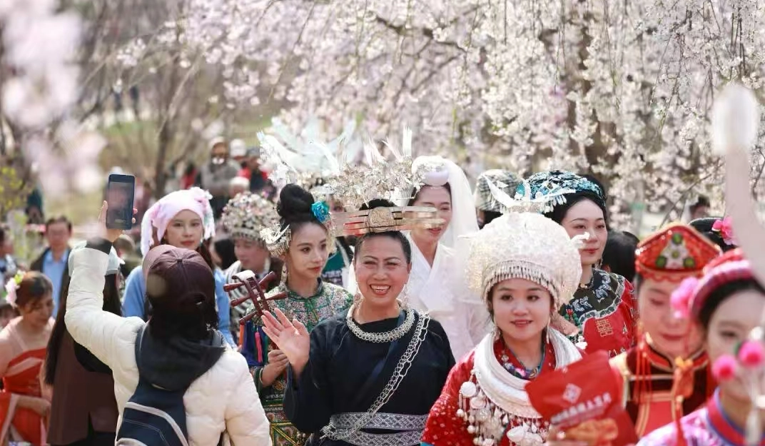 56位身着各民族盛装的“新娘”鱼贯而出,银饰叮当、衣袂飘飘,苗绣、蜡染、马尾绣等非遗手艺在樱花纷飞中熠熠生辉。