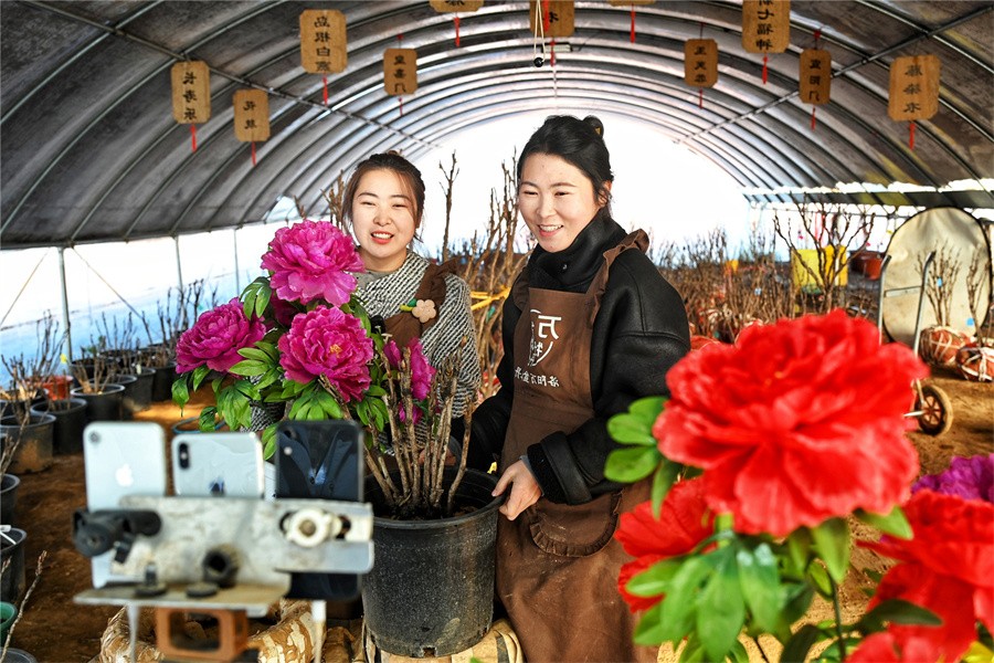 12月15日,洛阳市老城区邙山街道土桥社区温室大棚内,花农正通过网络平台直播带货,销售催花牡丹。