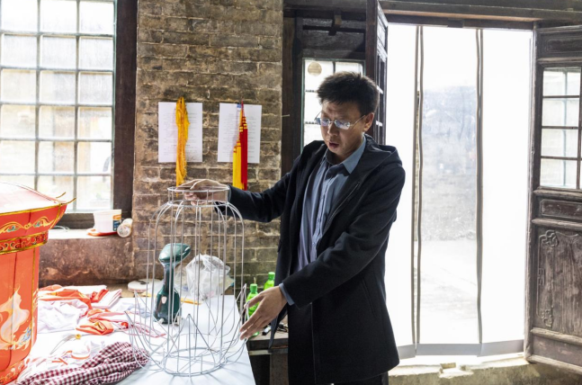 晋城市泽州县保福村,匠人在向游客介绍宫灯制作技艺。王剑摄