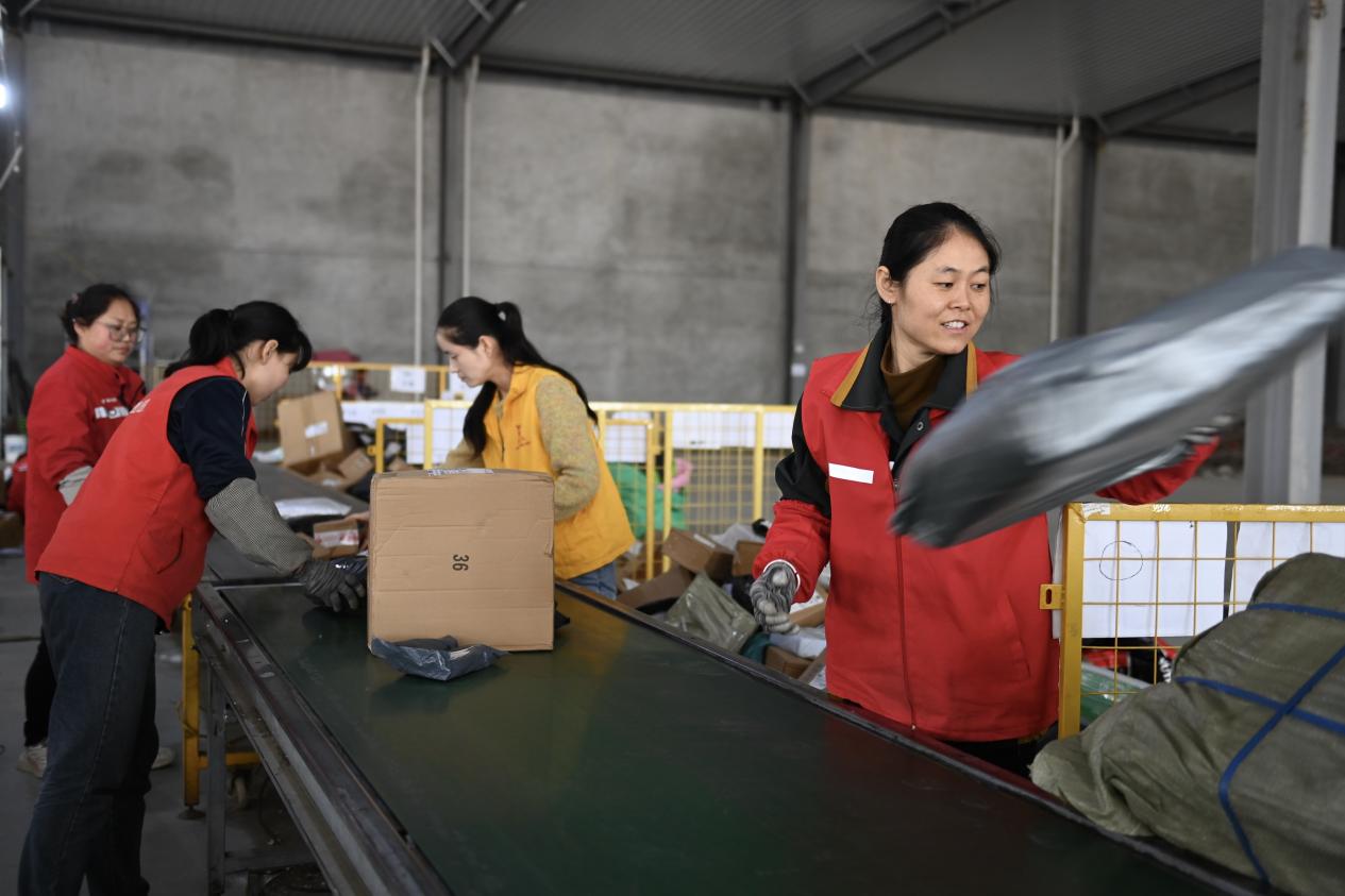 工作人员在陕西省扶风县拼多多进村中转仓分拣快递。陈斌摄