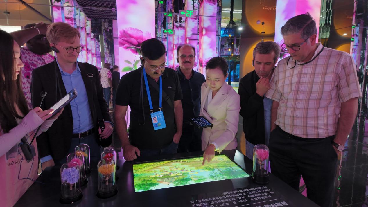图为2025“一带一路”中外媒体采访调研行(亚非欧团)的外国媒体记者参观中国斗南花卉展览馆。人民日报记者海南摄