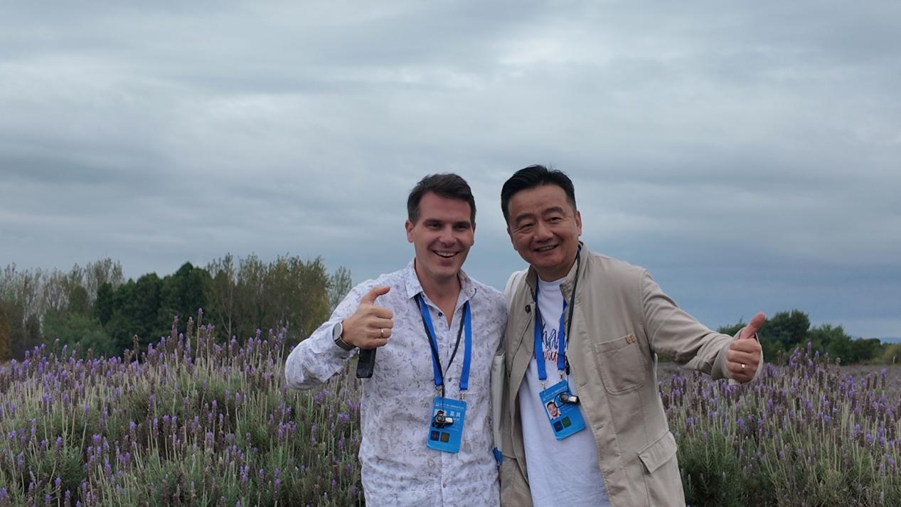 图为塞尔维亚记者协会董事会成员马尔科·内德尔伊科维奇(左)与丹麦《哥本哈根邮报》特别顾问威尔逊·朱参观薰衣草庄园。人民论坛记者李一丹 摄