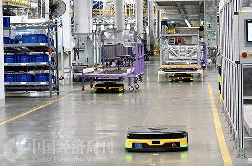 在焊装车间,原本以为要穿防护服、戴护目镜的记者发现,这里完全没有传统电焊车间那种火花四溅、刺鼻味道和难忍高温,取而代之的是大大小小上下翻舞的机械手臂和忙碌的AGV小车。