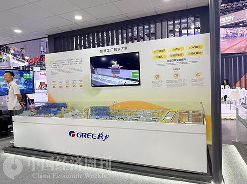 在智慧工厂解决方案的展示区,巨大的屏幕上各类数据实时跳动——设备状态、生产效率和物料信息一目了然。