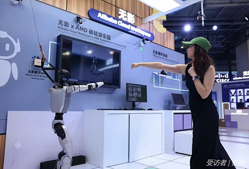 2025云栖大会上,参观者与人形机器人互动。