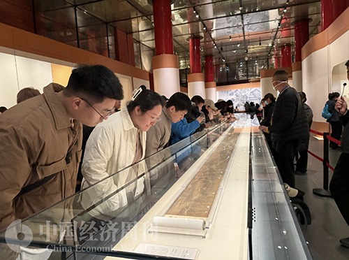 排在我前面的张女士是专程从上海坐飞机来的。“我2015年在故宫《石渠宝笈》上见过《清明上河图》,当时为了看这幅画,排了10小时,直到凌晨一点。这次在午门城楼上,空间大了很多,而且‘单线流动’的设置,虽然队伍长,但一直在动,避免了插队,我心里有底,这次应该不会等那么久了。”