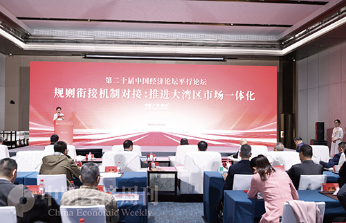 11月18日,“规则衔接机制对接:推进大湾区市场一体化”论坛在广东广州南沙国际会展中心举行,这是第二十届中国经济论坛的一场平行论坛。广东省有关部门,大湾区内地九市政府各部门,横琴、前海、南沙和河套四大平台代表,大湾区企业家代表,业内专家学者共聚一堂,为纵深推进大湾区市场一体化建言献策。