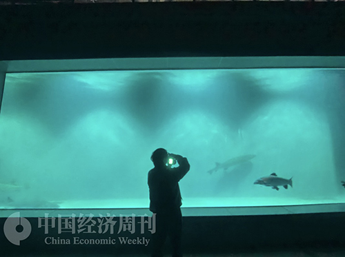 打开长廊后门,一个宽敞巨大的空间便出现在参观者面前。整个空间里摆满了大大小小的水池,从半米高到5米以上,依次有序排列。水池中则是不同种类、不同培育模式、不同生活习性的长江鱼类。在场馆的尽头,透明的巨大水缸中,甚至能看到体长超过两米的中华鲟。当它们从头顶游过,能让人瞬间感受到大自然的神奇。
