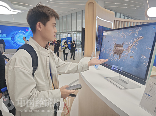 本刊记者体验发现,这款屏幕的神奇之处在于,只要站对了角度,就能全方位、立体地“看见”被展示物。而在旁观者的眼中,这就是一个人对着一块平平无奇的屏幕。