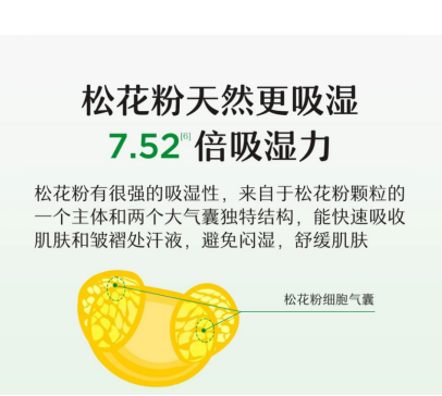 在技术方面,松达以成熟备制工艺精研,将其吸湿能力提升至普通产品的7.52倍,解决了天然成分活性不稳定”的难题,充分发挥了松花粉“天然微型营养库”的功效。依托科研团队加工与提取工艺,松达松花粉可帮助宝宝快速吸收脖子、腹股沟、屁股等肌肤褶皱处汗液 ,在皮肤表面形成细腻光滑的天然保护膜,舒缓闷热、泛红效果均提升9成以上。