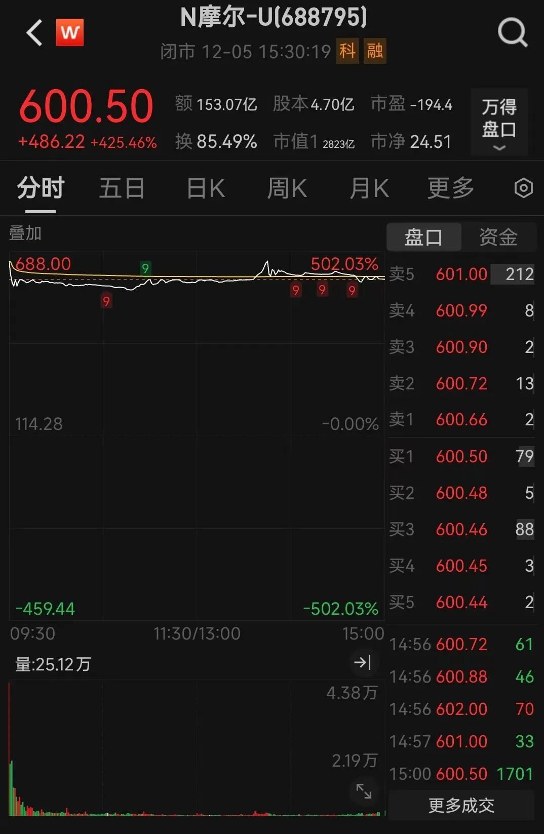 截至收盘,摩尔线程报600.5元/股,涨幅425.46%。按收盘价计算,中一签浮盈高达24.31万元。