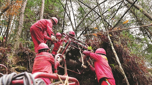 尽管无人机吊运为物探作业插上了翅膀,但在西南山区地形复杂的密林陡坡间,人力搬运仍是保障物资到位的关键一环。