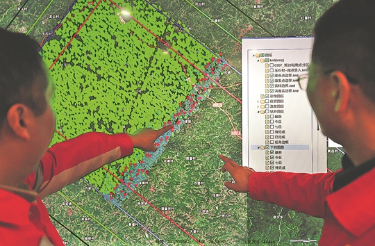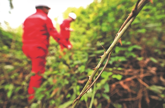 物探作业人员在布满荆棘的山林中,开展线路踏勘工作。