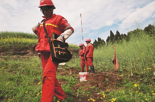绿色施工是另一道考题。项目涉及64个乡镇,在施工前,分公司物探201-211联队提前制定协调保障方案,通过“区县、乡镇、村社、户”四级机制挨个摸排。资阳市安岳县杨柳村,连片油菜花开得正盛。党员突击队放线攻坚班班长陈璟带着工友穿行其间,轻声叮嘱:“慢一点,顺着枝隙走。”作业人员提着节点设备侧身而过,蹲身清理浮土,按“体耦合埋置八步法”埋置检波器,完工后又细心扶正被碰到的花枝。作业前全员踏勘作物区,依地形规划专属路线;大面积采用体积小、占地少的节点设备,精准埋置于田埂间隙,严守不踩苗、不损枝、不扰农原则。