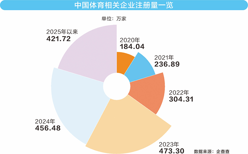 从企业层面看,体育相关企业注册量也呈现爆发式增长。企查查数据显示,截至2025年11月19日,国内现存体育用品相关企业多达1754.11万家。从注册量来看,2021年以来,体育相关企业年注册量显著提升。2023年达到峰值,全年企业注册量多达473.3万家,同比增长55.53%。2025年以来已注册企业达到421.72万家,全年有望超越2024年水平。