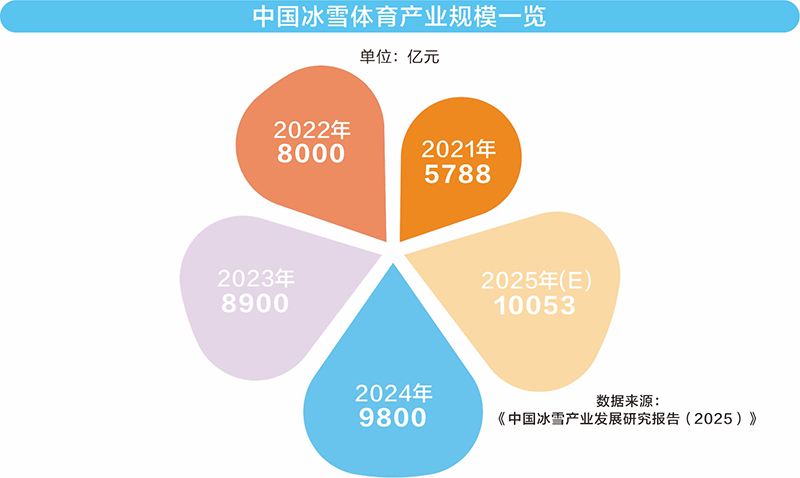 冰雪产业正处于快速发展阶段,当前我国已实现“带动3亿人参与冰雪运动”的目标。《中国冰雪产业发展研究报告(2025)》显示,2015年以来,中国冰雪产业规模显著增长,从2700亿元迅速扩张至2024年的9800亿元,今年有望突破万亿元大关,达到10053亿元。