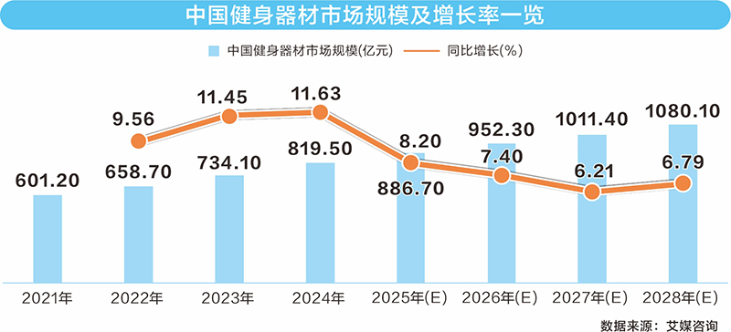 从体育用品细分产业来看,运动鞋服是规模最大、消费最活跃的品类。根据艾媒咨询,2024年中国运动鞋服市场规模为5425亿元,同比增长10.13%,预计2025年中国运动鞋服市场规模将达到5989亿元,同比增长10.40%。健身器材赛道同样未来可期,2024年中国健身器材市场规模为819.50亿元,同比增长11.63%,预计2027年市场规模将突破千亿元大关,达到1011.40亿元。
