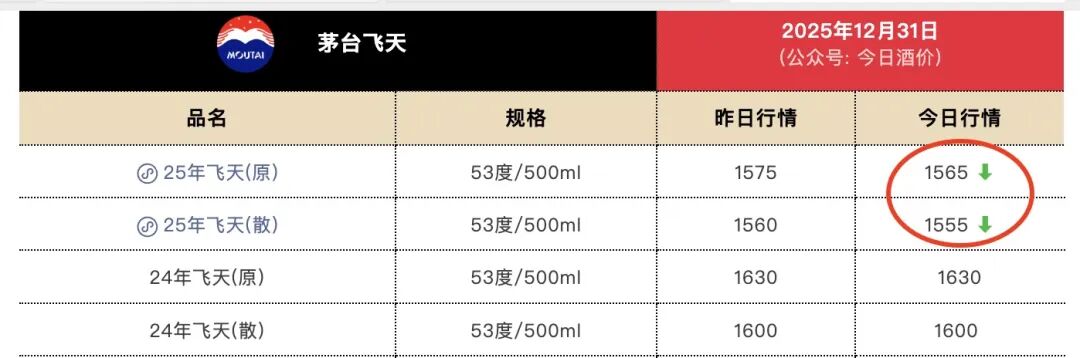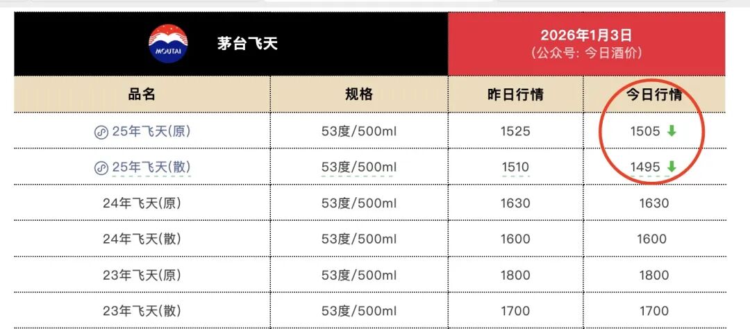 据第三方平台披露的批发参考价,2026年1月3日,2025年53度/500ml的飞天茅台原箱最新行情价为1505元/瓶,2025年飞天茅台散瓶行情价则为1495元/瓶,均较2025年12月31日下跌60元/瓶。
