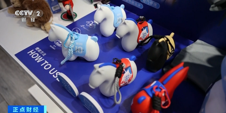 浙江义乌某体育用品门店负责人 骆添乐:我们拥有8个顶级国家队以及8个超级豪门俱乐部的全品类授权,例如冰箱贴、胸章、袖扣、徽章这些周边产品、纪念品,还有毛绒玩具,我们都有在开发。