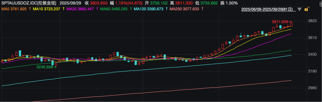 9月29日,现货黄金盘中站上3800美元/盎司,再刷新历史纪录。截至发稿,伦敦金现涨约1.2%,报3803.65美元/盎司。