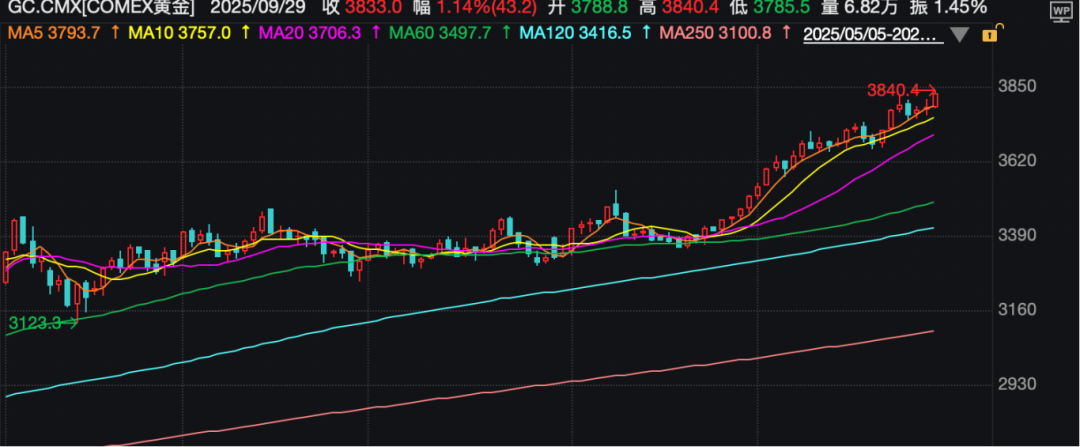 COMEX黄金盘中亦刷新历史纪录,最高至3840.4美元/盎司。
