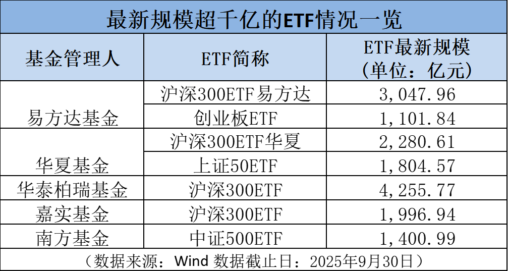 此外,上证50ETF、中证500ETF、创业板ETF等产品规模也超过千亿元。