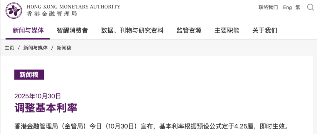 10月30日,香港金融管理局(以下简称香港金管局)将基准利率下调25个基点至4.25%,即时生效。