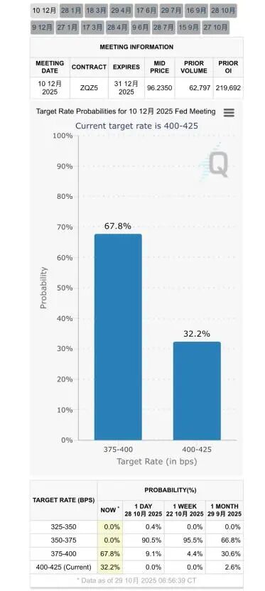 据CME“美联储观察”,美联储12月降息25个基点的概率降至67.8%。