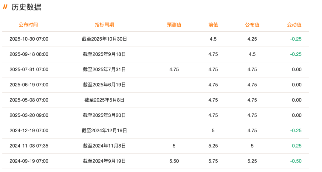 10月30日,香港金管局将基准利率下调25个基点至4.25%,即时生效。这是继9月之后连续第二次降息。9月18日,香港金管局将基准利率下调25个基点至4.50%。
