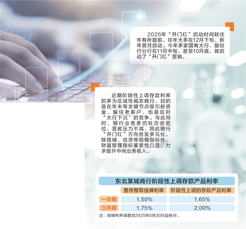 多位银行工作人员告诉记者,2026年“开门红”启动时间较往年有所提前,往年大多在12月下旬、新年首月启动。据记者梳理发现,今年多家国有大行、股份行分行在11月中旬,甚至10月底,就启动了明年“开门红”营销。