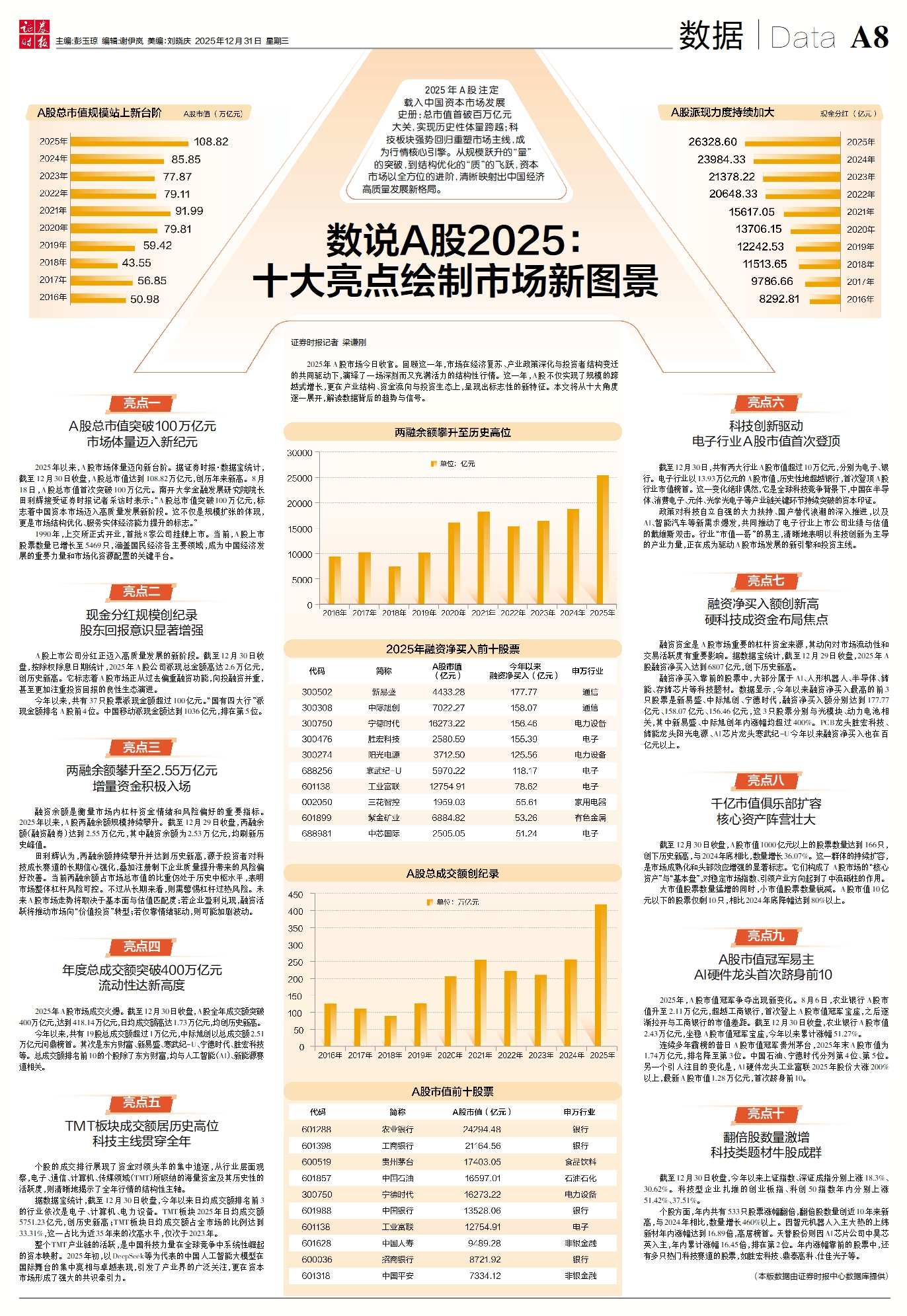2025年以来,A股市场体量迈向新台阶。据证券时报·数据宝统计,截至12月30日收盘,A股总市值达到108.82万亿元,创历年来新高。8月18日,A股总市值首次突破100万亿元。南开大学金融发展研究院院长田利辉接受证券时报记者采访时表示:“A股总市值突破100万亿元,标志着中国资本市场迈入高质量发展新阶段。这不仅是规模扩张的体现,更是市场结构优化、服务实体经济能力提升的标志。”