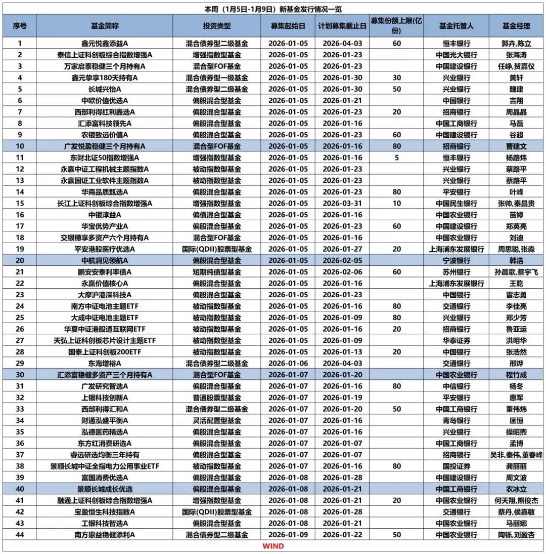 本周(1月5日—1月9日),全市场共有44只新基金(仅统计主代码)面市,2026年首个交易日,就有28只新基金“同台竞技”。其中,主动权益型基金和指数型基金成为发行主力。