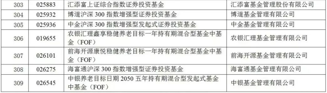 从产品类型看,此次新纳入的个人养老金基金产品类型较为多元化,既有普通指数基金、指数增强基金,还有稳健型养老目标基金以及养老目标日期基金。