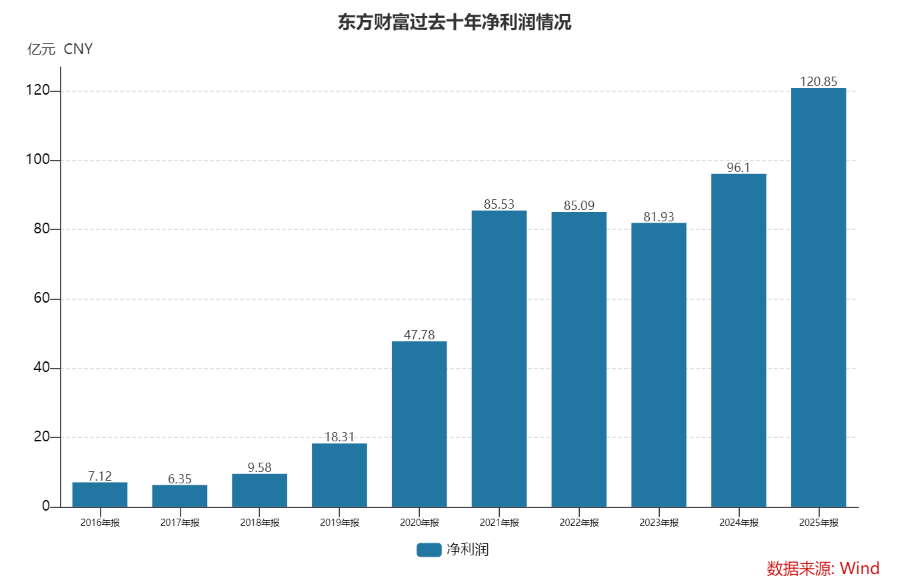 3月19日晚间,东方财富发布2025年年度报告,2025年实现净利润120.85亿元,同比增长25.75%,创下历史新高。