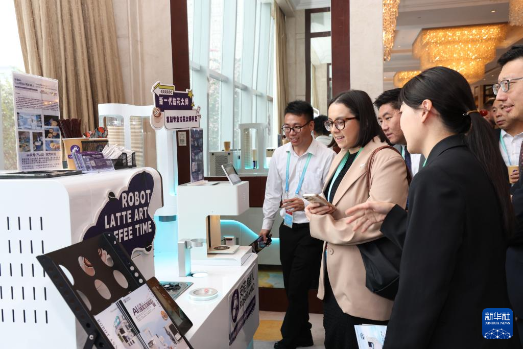 12月11日,嘉宾在会议间隙体验咖啡机器人。新华社记者 梁旭 摄