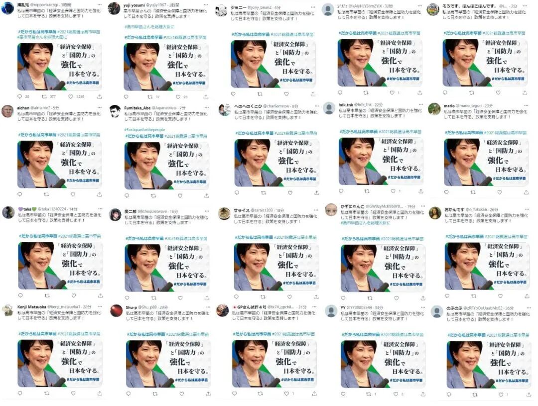 日本社交媒体平台充斥如“当然只能支持高市早苗”“高市早苗拜托了”等内容相似的帖文。