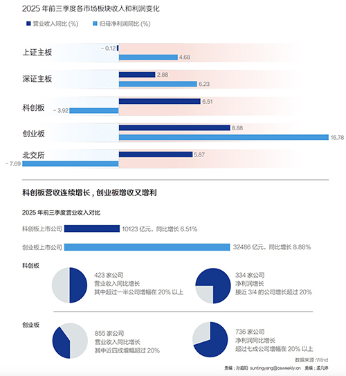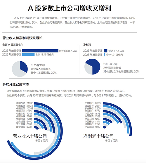 A股上市公司2025年三季报披露收官。已披露三季报的上市公司中,77%的公司前三季度获得盈利,54%公司盈利同比增长。其中,创业板公司表现亮眼,营业收入和净利润双双增长。上市公司回馈股东意识增强,一年多次分红已成为常态。