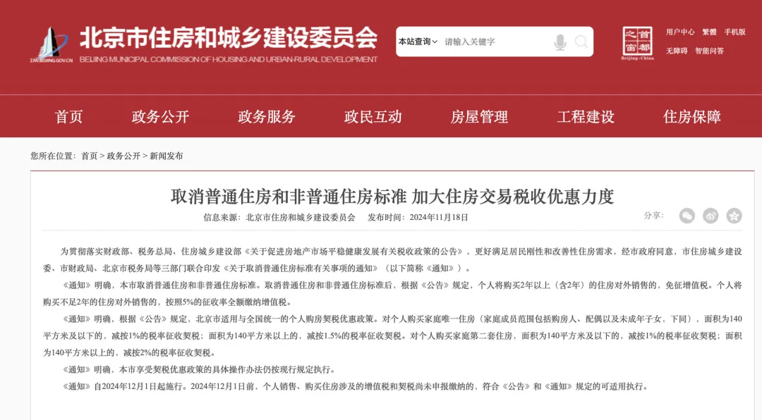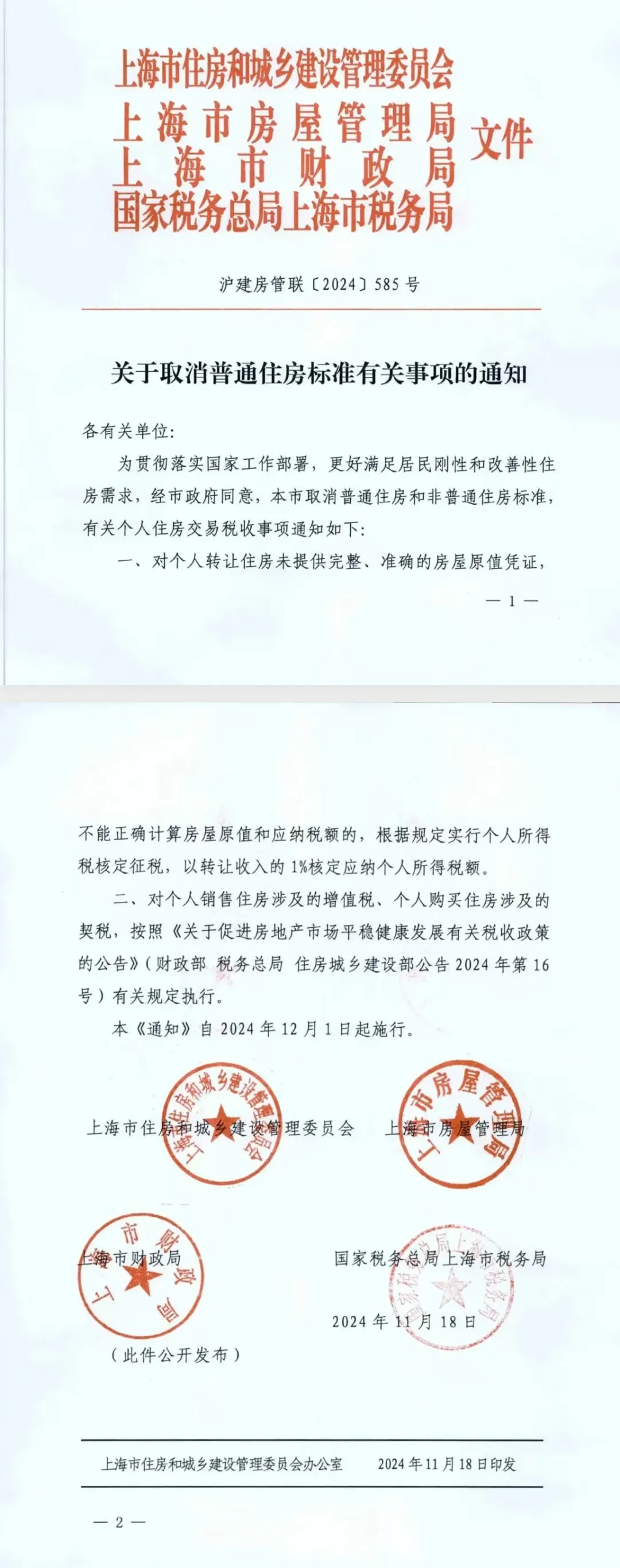 11月18日,上海市住建委发布关于取消普通住房标准有关事项的通知:明确取消普通住房和非普通住房标准;明确取消标准后相关个人住房交易税收事项。通知自2024年12月1日起施行。