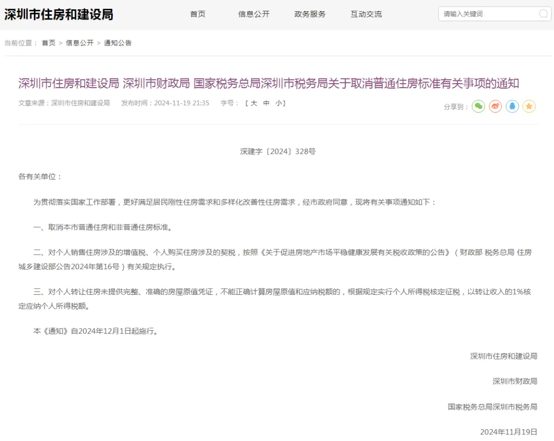 11月19日,深圳市住房和建设局、深圳市财政局、国家税务总局深圳市税务局等三部门联合印发《关于取消普通住房标准有关事项的通知》,明确自2024年12月1日起取消普通住房和非普通住房标准,并对相关征税问题予以明确。