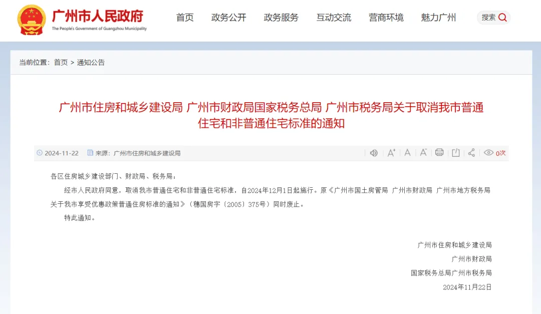 11月22日,广州市住房和城乡建设局、广州市财政局国家税务总局、广州市税务局发布通知,经市人民政府同意,取消广州市普通住宅和非普通住宅标准,自2024年12月1日起施行。原《广州市国土房管局 广州市财政局 广州市地方税务局关于我市享受优惠政策普通住房标准的通知》(穗国房字〔2005〕375号)同时废止。