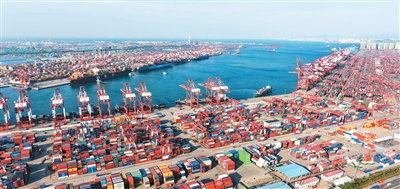 图为山东港口青岛港繁忙作业的外贸集装箱码头。