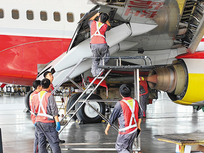 在位于海口空港综合保税区的海南自贸港一站式飞机维修产业基地,工作人员正在对一架民航客机进行检修。