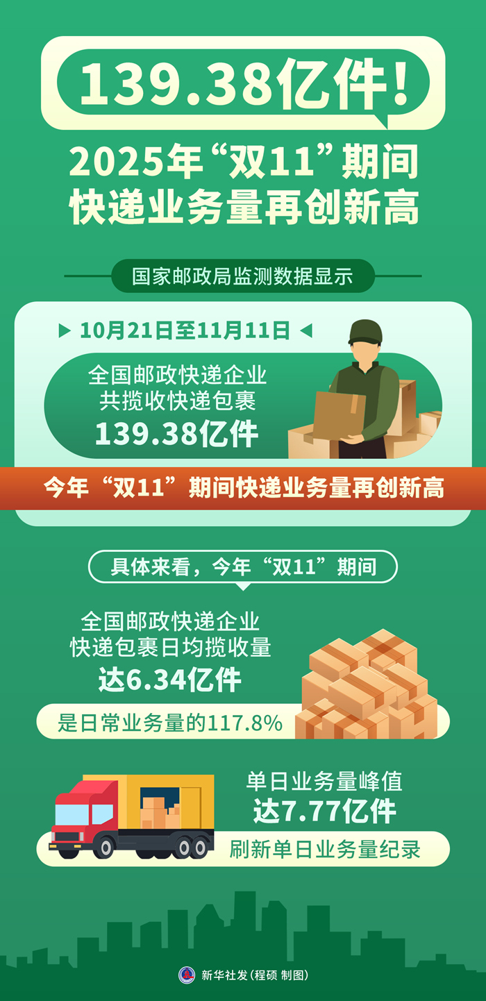 新华社北京11月12日电(记者叶昊鸣)记者11月12日从国家邮政局获悉,国家邮政局监测数据显示,10月21日至11月11日,全国邮政快递企业共揽收快递包裹139.38亿件,今年“双11”期间快递业务量再创新高。 具体来看,今年“双11”期间,全国邮政快递企业快递包裹日均揽收量达6.34亿件,是日常业务量的117.8%;单日业务量峰值达7.77亿件,刷新单日业务量纪录。 据国家邮政局有关负责人介绍,今年“双11”期间,邮政快递行业积极强化与电商平台信息协同,通过优化邮快件处理流程,确保运行更加平稳有序。各寄递企业加大投入,在处理场所、设施设备、运力配置和信息系统等方面进行升级,有效提升行业承载能力和运行效率。在快递末端,各寄递企业通过科技赋能、资源整合、增派人员、调整班次等,进一步丰富快递末端服务模式,提升末端服务保障能力。 这名负责人表示,为缓解一线快递员旺季工作压力,各地邮政管理部门发布了消费提示,呼吁公众对快递员给予更多理解与包容。同时,督促各寄递企业全面落实快递员群体权益保障工作,确保合理劳动报酬,畅通诉求反映渠道,通过务实举措让快递员在工作中有更多的获得感与幸福感。 据了解,今年“双11”期间,各寄递企业联合上游电商企业使用原发包装、免胶带纸箱和可循环包装,并加大了新能源车辆应用力度,打造绿色旺季。