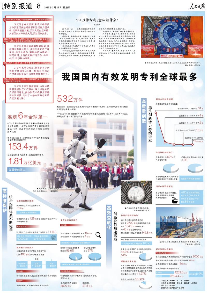 本报北京2月25日电(记者谷业凯)国家知识产权局数据显示:我国国内有效发明专利达532万件,成为世界上首个国内有效发明专利数量突破500万件的国家。“十四五”时期,我国国内有效发明专利数量持续增长,每万人口高价值发明专利拥有量达16件。截至2025年,我国发明专利申请量已连续多年位居全球第一,成为名副其实的专利大国。